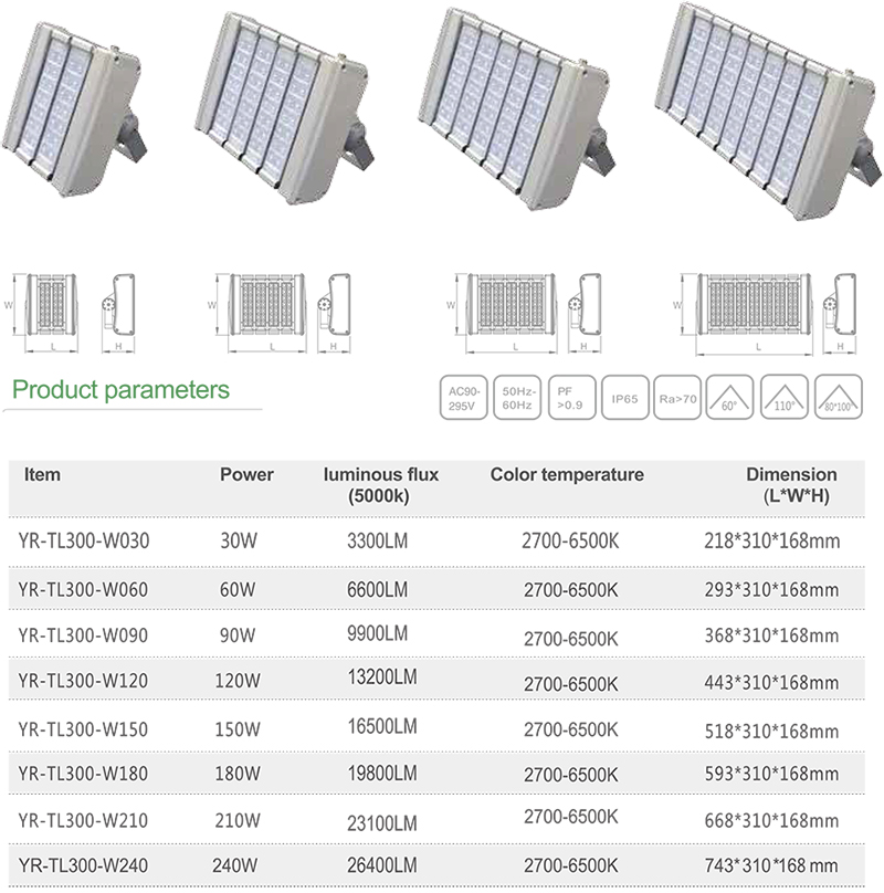 YR-TL300 Series LED tunnel lights from Yaorong Technology are designed to offer precise symmetrical or asymmetrical photometric distribution for tunnel and underpass lighting. Designed to meet recommended luminance and illuminance requirements set by all national and international standards, YR-TL300 features a modular configuration that provides a complete and scalable wattage from 30W to 240W and light output from 3,300 to 26,400 delivered lumens. This scalability allows flexible combinations of light modules for various application needs. Constructed from die cast aluminum electrostatically sprayed with a polyester powder paint finish, the luminaire housing with integrated heat sink offers superior thermal management through heat dissipation and thermal conduction. The modular light engines utilize LUXEON Rebel LEDs that deliver industry-leading efficacy, lifetime and reliability. Precision designed optics provides optimized photometric performance and light distributions to avoid black-hole and flicker effect in either probeam or counterbeam orientation. The high performance Mean Well constant current driver an unparalleled level of efficiency and reliability with enhanced protection features including overcurrent, short-circuit, overvoltage and over-temperature protections. The optical assembly and driver compartment are hermetically sealed to provide IP65 ingress protection.
