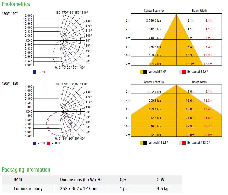 UFO style fixture is specifically designed to provide high output lighting with superior glare-free illumination to improve safety and energy savings in commercial and industrial workspaces, while enhancing productivity and efficiency. The high bay series can be used for a variety of high and low locations such as warehouses, factories, retail stores, and sports arenas. High performance Nichia LED light engines delivering up to 100 lumens per watt. 100W, 120W and 150W LEDs provide 10000, 12000, and 15000 initial delivered lumens repsectively. Custom engineered LED optics provides consistent optical alignment and delivers repeatable photometric performance with 50,000 hour rated lamp life at 70% lumen maintenance. Employing a patented die cast aluminum chassis with integral fins for efficient heat dissipation and long service life, its heat sink construction and the vertical integration of the driver housing carries an IP rating of IP65 which make it less likely to attract dust and dirt, . Available in three beam angle options - 50°, 80°, 120°. Compatible with PWM, 1-10V, resistance dimming.