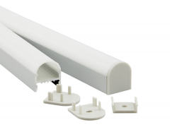 The D001 surface mount LED profile offers a versatile LED linear lighting solution that deliver more configurability than T5/T8 LED tubes. With seamless end-to-end connection capability, the slim profile provides probably the most affordable continuous-row lighting system available on the market. Whether you are seeking to add task lighting to a kitchen, office, or workstation, or you simply want to give a decorative accent to cabinets, closets, or coves, the D001 aluminum profile is a good fit for these applications. The LED channel accommodates white, single color or RGB LED strips with a width of 16mm or less. The LEDs shine light through a curved, milky polycarbonate diffuser for a homogeneous light output with no visible LED pixilation or hot spots. Frosted or clear PC lenses are also available to ensure optimum light transmission. The UV and impact resistant lenses are snapped into the extrusion or can be slid into the aluminum channel from the side. The profile is provided with design matching end caps for internal component protection as well as giving the profile a finished look. The high quality profile is made of 6063-T5 aluminum alloy that provides high efficiency passive heat dissipation to keep the LED junction temperature under control.